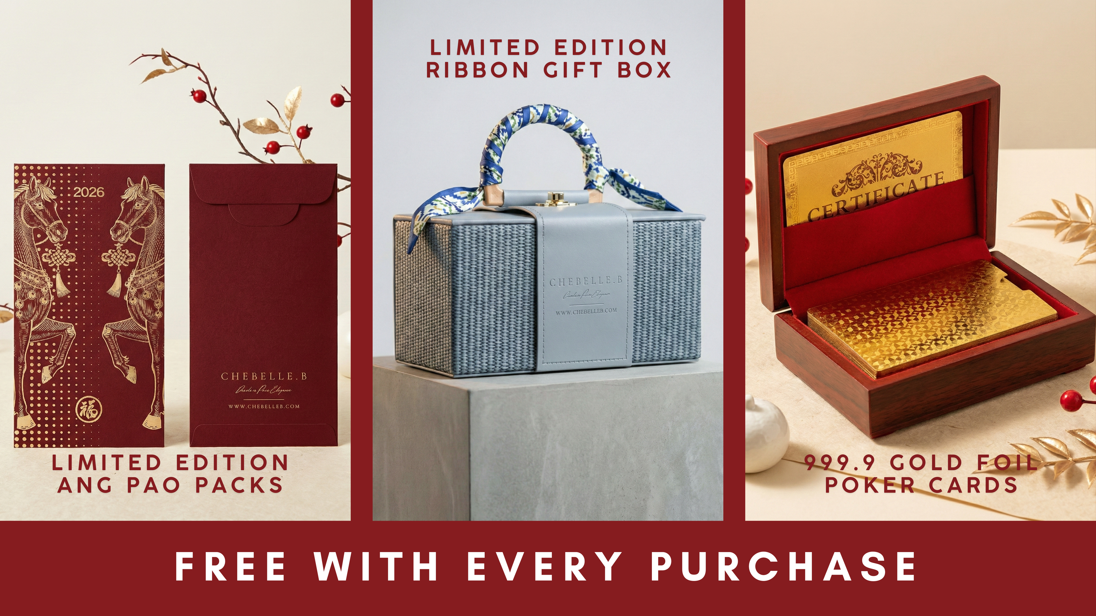 With every purchase, you will receive our Limited Edition Ribbon Gift Box, 999.9 Gold Foil Poker Card Set, Premium Ang Pao Pack, Valentines & CNY Greetings Card, LED Jewelry Box, Silver Polishing Cloth. While Stock Last. No minimum spend required. Free Shipping on All Orders in Malaysia.