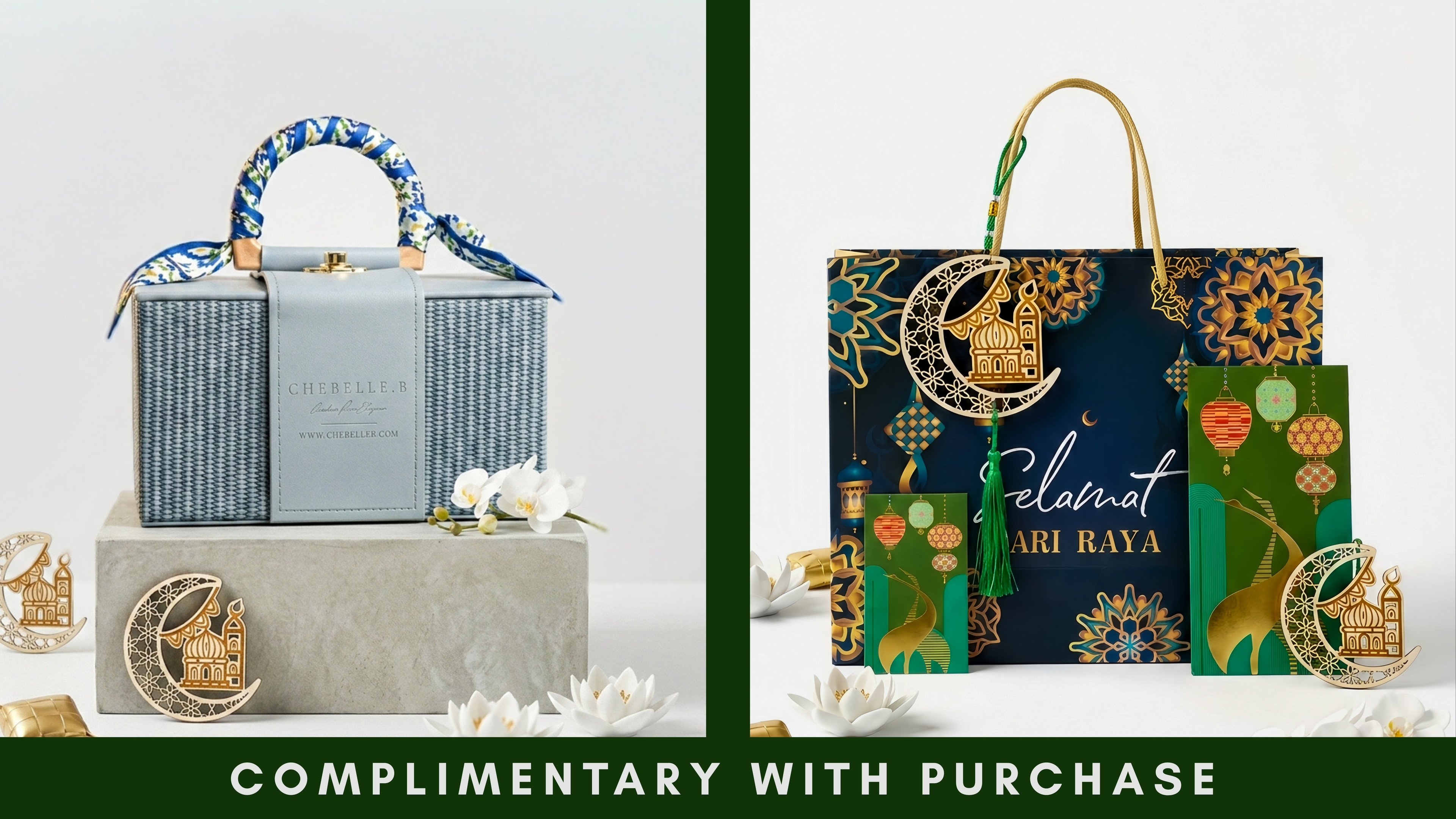 Each piece comes beautifully packaged with our exclusive Ribbon Gift Box, an LED Jewelry Box, a Wooden Crescent Ornament, Sampul Raya, a Greetings Card, and a Silver Polishing Cloth. There is no minimum spend required, and you'll enjoy Free Shipping on all orders within Malaysia!