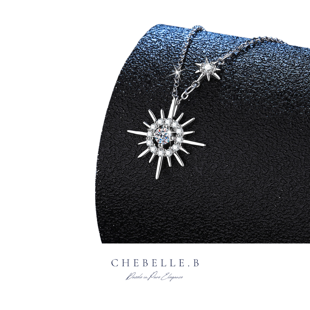 The Moissanite stone’s diamond-like sparkle radiates from the center, creating an enchanting effect that complements the whimsical, celestial theme. Perfect for both formal and casual wear, this necklace is a stunning choice for adding a touch of cosmic elegance to any outfit.