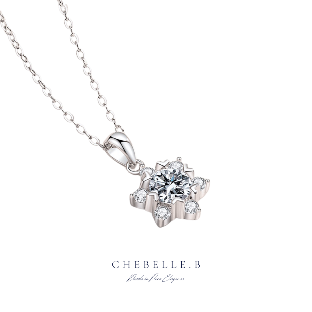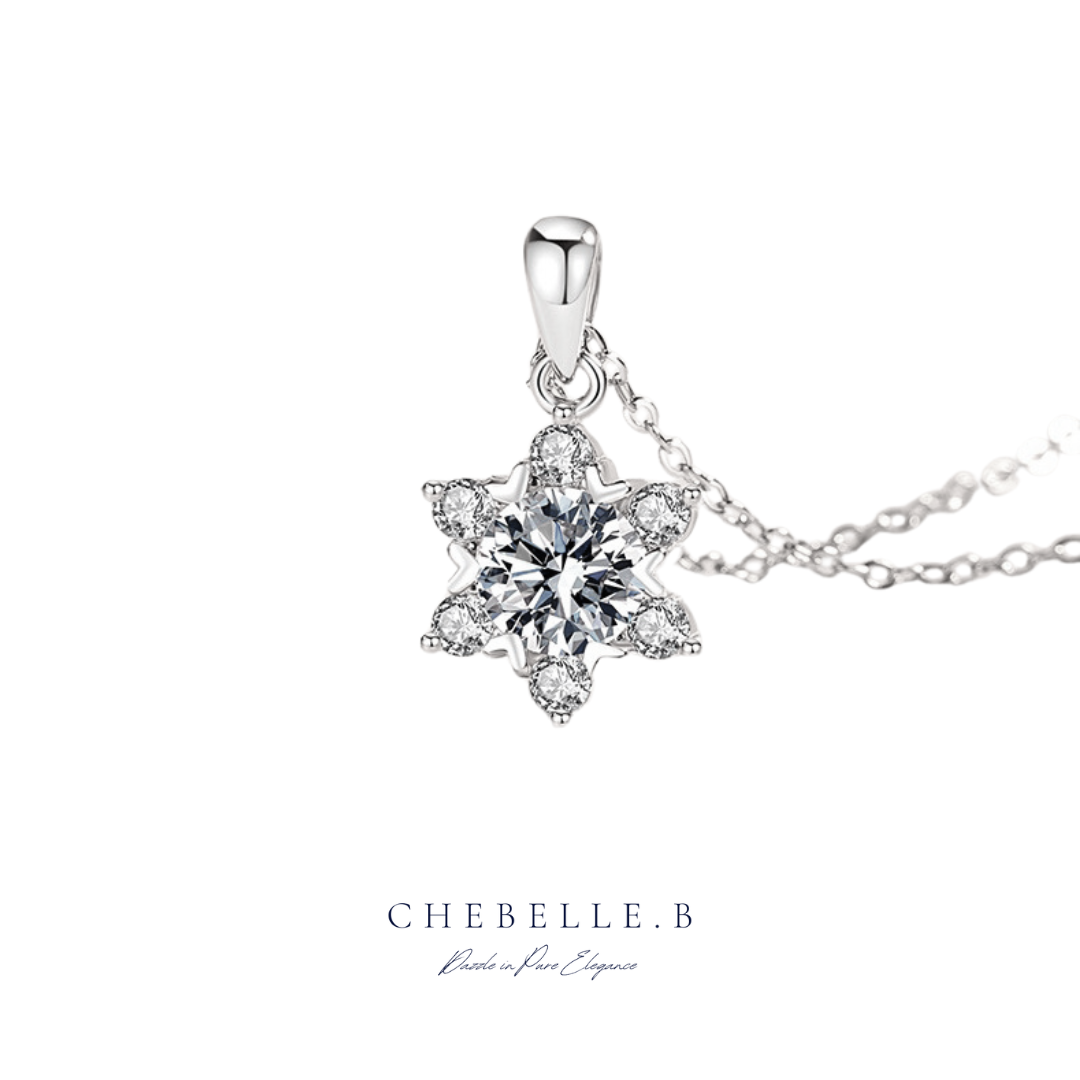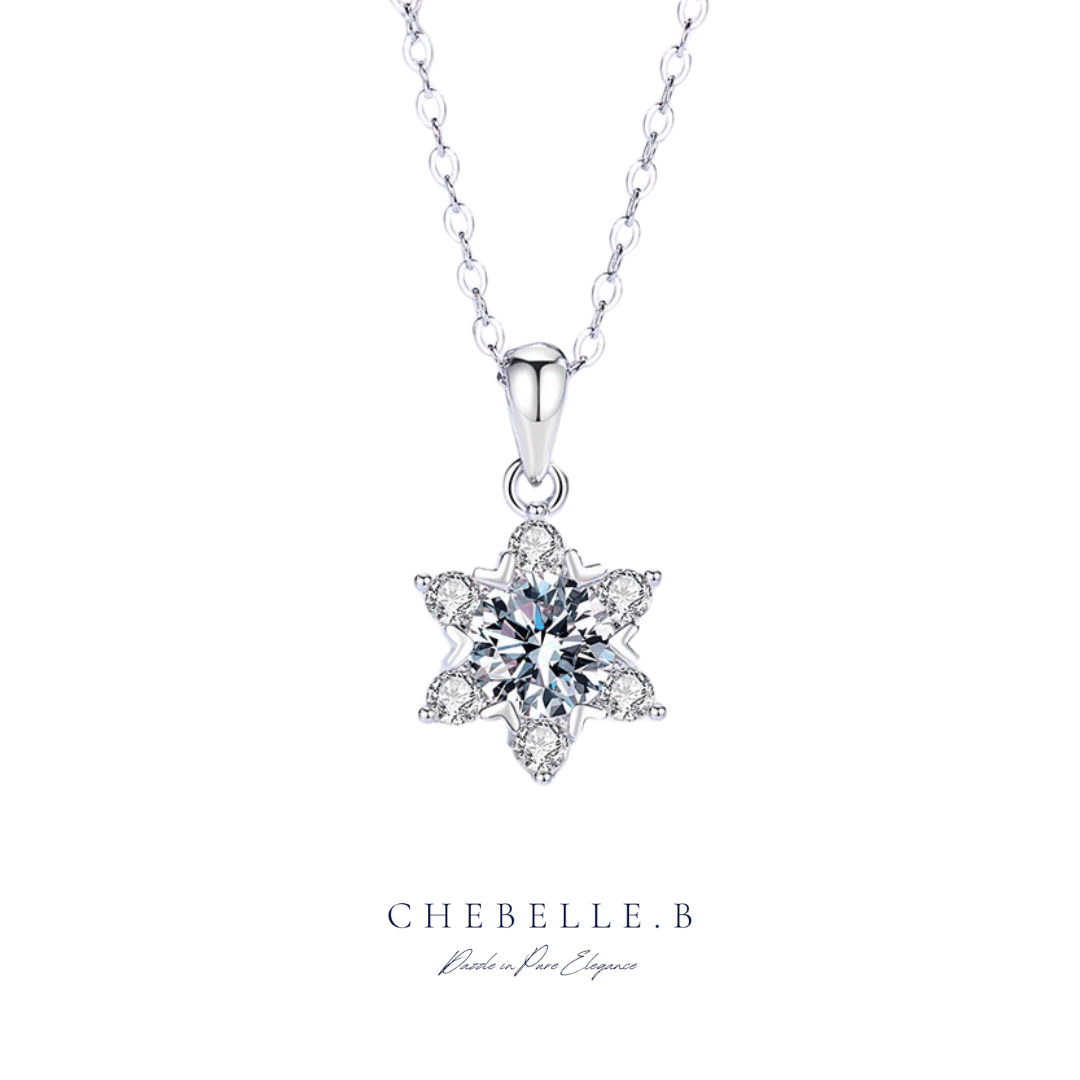 This elegant necklace features a brilliant 1-carat Moissanite gemstone, set in a unique hexagonal snowflake pendant crafted from high-quality S925 sterling silver. The Moissanite stone, renowned for its diamond-like sparkle, is surrounded by a beautifully detailed snowflake design, symbolizing winter’s beauty and purity.
